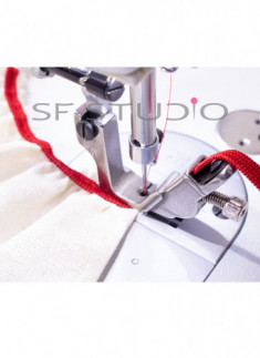 The tape or elastic inserted in the slot in the Presser foot should be 1/4" wide. However, we tried with a round Elastic cord and that worked beautifully too. Very useful and time saving when we need to sew elastic at the waist of a dress or in the sleeves, we just need to feed the elastic in the slot given in the presser foot and Lay the fabric to which it is to be sewn under the presser foot. Similarly decorative trims, lace, ribbon also can be sewn easily at the sleeve hem or dress hem using this presser foot.